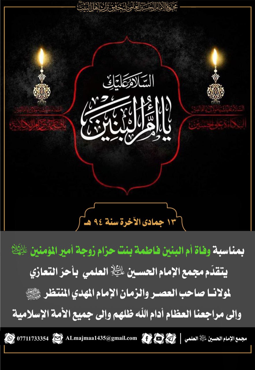 وفاة أم البنين فاطمة بنت حزام زوجة أمير المؤمنين عليها السلام